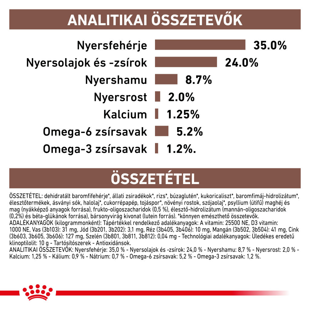 Ingrediente: proteină uscată din carne de pasăre*, grăsime animală**, gluten de grâu*, orez*, făină de porumb*, proteine animale hidrolizate*, produse din drojdie, minerale, pulpă de sfeclă, pudră de ou*, fibre vegetale, ulei de soia**, ulei de pește**, psyllium (coji și semințe), fructo-oligozaharide, drojdie (sursă de manan-oligozaharide și beta-glucani), ulei de alge Schizochytrium sp. (sursă de DHA)**, făină de gălbenele. Ingrediente ușor digerabile: *Surse de proteine ușor digerabile: 60,8%, **Surse de grăsimi ușor digerabile: 16,1%.