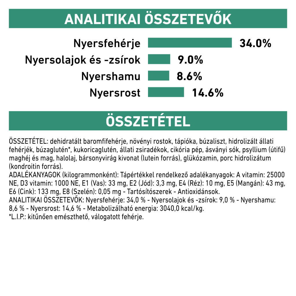 Ingrediente: proteină uscată de pasăre, lignoceluloză, manioc (tapioca), făină de grâu pentru furaje, proteină animală hidrolizată, gluten de grâu pentru furaje, gluten de porumb, grăsime animală, fibre de cicoare, minerale, psyllium (coji și semințe), ulei de pește, făină de gălbenele, glucozamină din fermentație, cartilaj hidrolizat (sursă de condroitină).
