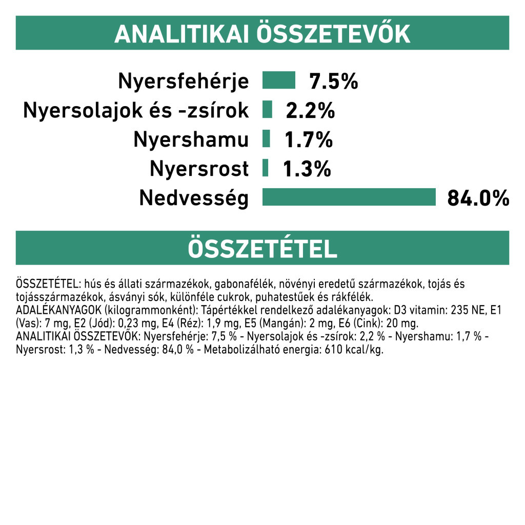 Constituenți analitici: Proteină brută: 7,6% - Fibră brută: 1,1% - Conținut de grăsimi: 2,3% - Cenușă brută: 1,7% - Umiditate: 84,0% - Energie metabolizabilă: 607 kcal/kg.