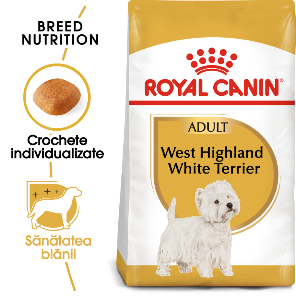Recomandată câinilor din rasa West Highland White Terrier cu vârsta de peste 10 luni, hrana ROYAL CANIN® West Highland White Terrier Adult a fost special concepută pentru a răspunde tuturor cerințelor nutriționale ale câinelui dumneavoastră adult.