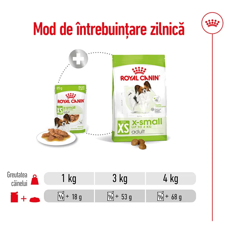 ROYAL CANIN® X-Small Adult fâşii în sos este o hrană umedă completă şi echilibrată din punct de vedere nutriţional, special dezvoltată pentru a răspunde cerinţelor specifice câinilor de talie foarte mică şi pentru a-i susţine pe parcursul vieţii de adult. Această hrană este potrivită câinilor de talie foarte mică, cu o greutate de până la 4 kg şi care au peste 10 luni.