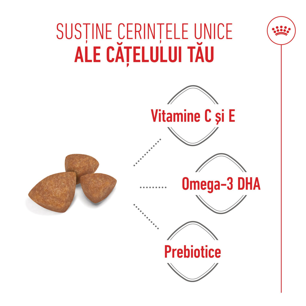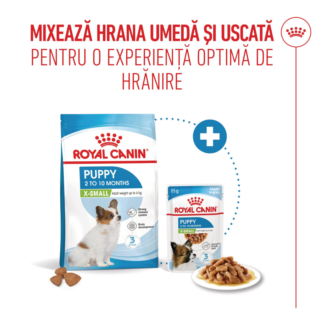 Formula ROYAL CANIN® X-small Puppy este special concepută pentru a îndeplini cerințele nutriționale ale cățeilor de talie foarte mică. Această rețetă este dedicată cățeilor cu vâsta cuprinsă între 2 și 10 luni, care vor avea la stadiul de adult o greutate de până la 4 kg. Această rețetă adaptată este îmbogățită cu acizi grași omega-3 (precum DHA), a căror acțiune dovedită științific sprijină dezvoltarea cerebrală sănătoasă a cățeilor.