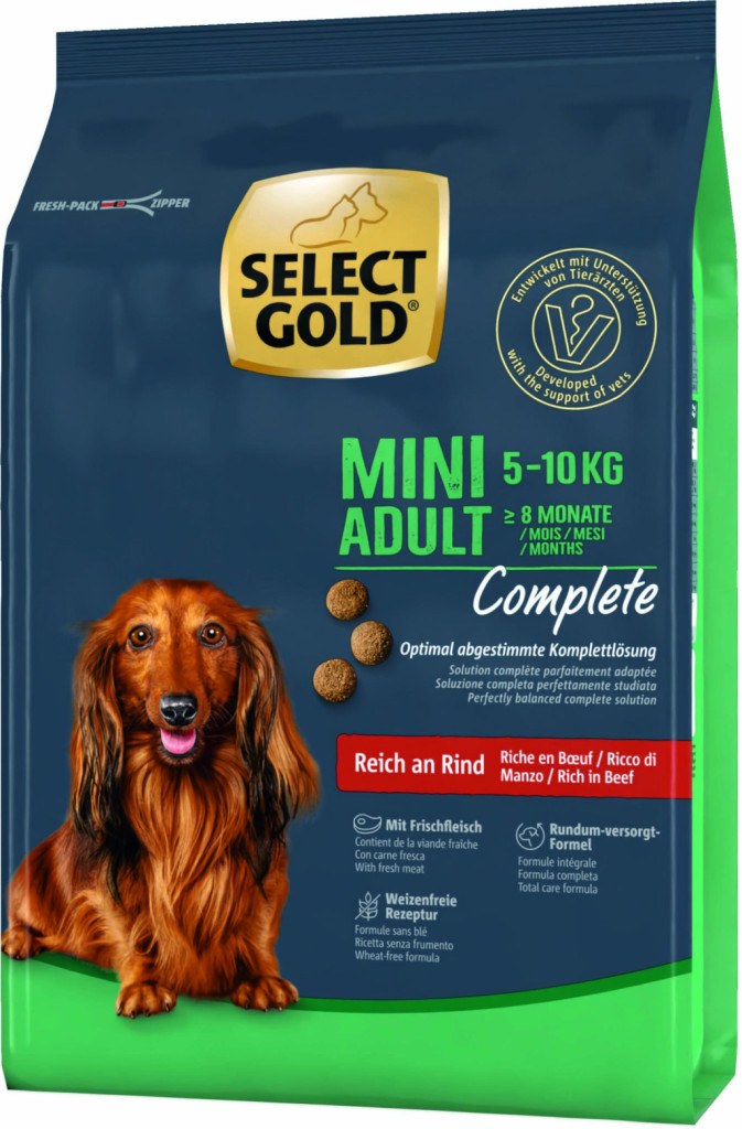 Ingrediente: carne de vită proaspătă (20%), proteină de pasăre (19%), porumb (18%), făină de porumb (16,5%), uleiuri și grăsimi (6%), orez (4%), mei și sorg (4%), pulpă de sfeclă uscată (3,5%), proteină de pasăre (3%, hidrolizată), semințe de in (2,2%), lignoceluloză (1%), clorură de sodiu (0,4%), carbonat de calciu (0,35%), clorură de potasiu (0,3%), pereți celulari de drojdie (0,2%, uscat, corespunde la 0,038% MOS u. 0,042% beta-glucani), inulină de cicoare (0,1%).