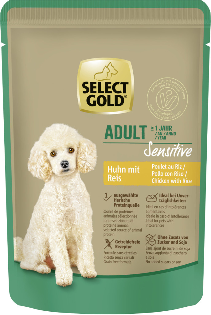 Select Gold Sensitive Adult Pui cu Orez.Furaj complet pentru câini adulți.Compoziție: pui (inimi, carne, pipote, ficat, gâturi, grăsime) 68%, orez 4%, substanțe minerale 1%, ulei de floarea-soarelui 0,2%, fructo-oligozaharide 0,2%, ulei de rapiță 0,1%.Constituenți analitici: proteină 10,2%, conținut de grăsimi 5,1%, cenușă brută 2,6%, fibre brute 0,4%, umiditate 80%, calciu 0,21%, fosfor 0,19%.Aditivi/kg: aditivi nutriționali: vitamina D3 200 UI, 3b202 (iod) 0,75mg, 3b503 (mangan) 1,4mg, 3b605 (zinc) 25mg, 3b405 (cupru) 1,5mg, 3a880 (biotină) 300μg.Recomandare de hrănire: Datele reprezintă valori de referință.Data expirării / nr. lot / numărul producătorului: vezi inscripția tipărită.info@fressnapf.ro