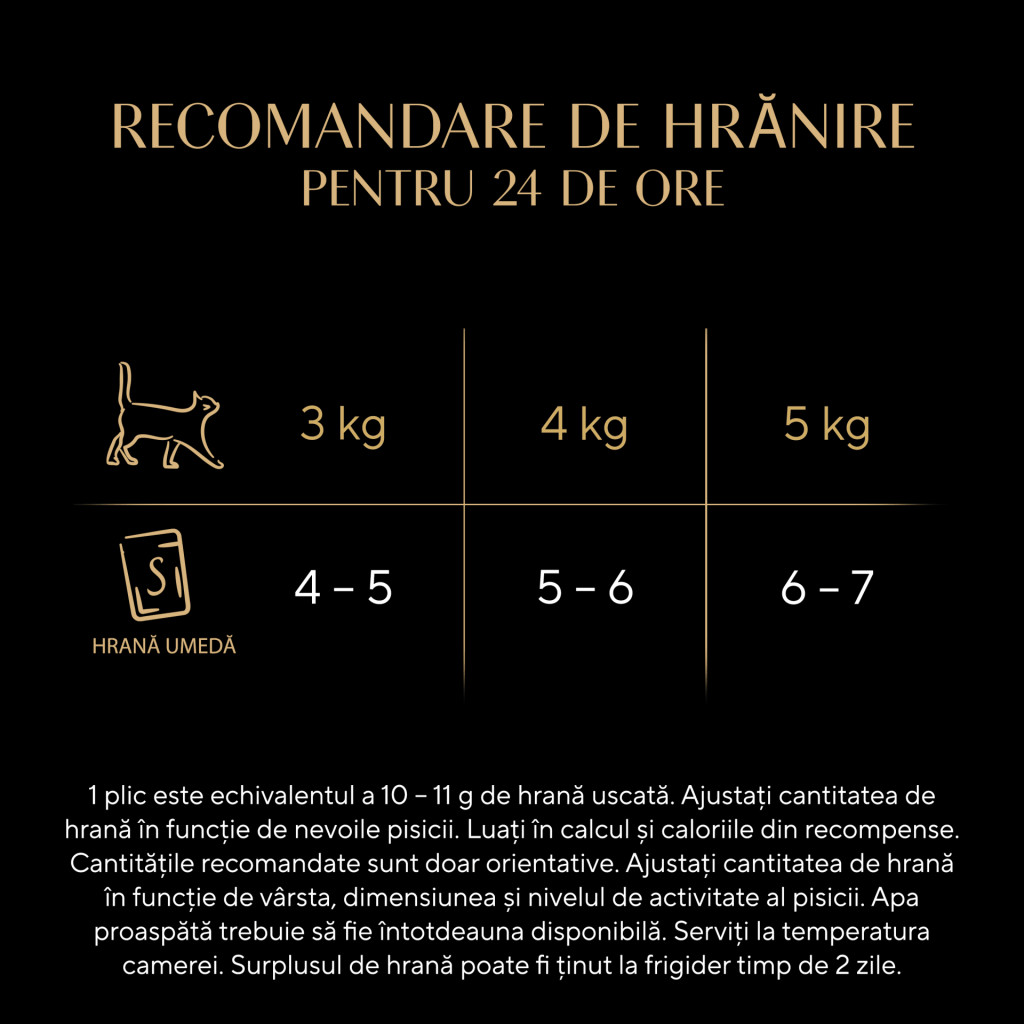 O pisică de 3 kg necesită 4–5 pliculețe zilnic, o pisică de 4 kg necesită 5–6 pliculețe zilnic, o pisică de 5 kg necesită 6–7 pliculețe zilnic.