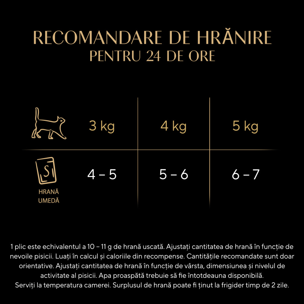 O pisică de 3 kg necesită 4–5 pliculețe zilnic, o pisică de 4 kg necesită 5–6 pliculețe zilnic, o pisică de 5 kg necesită 6–7 pliculețe zilnic.
