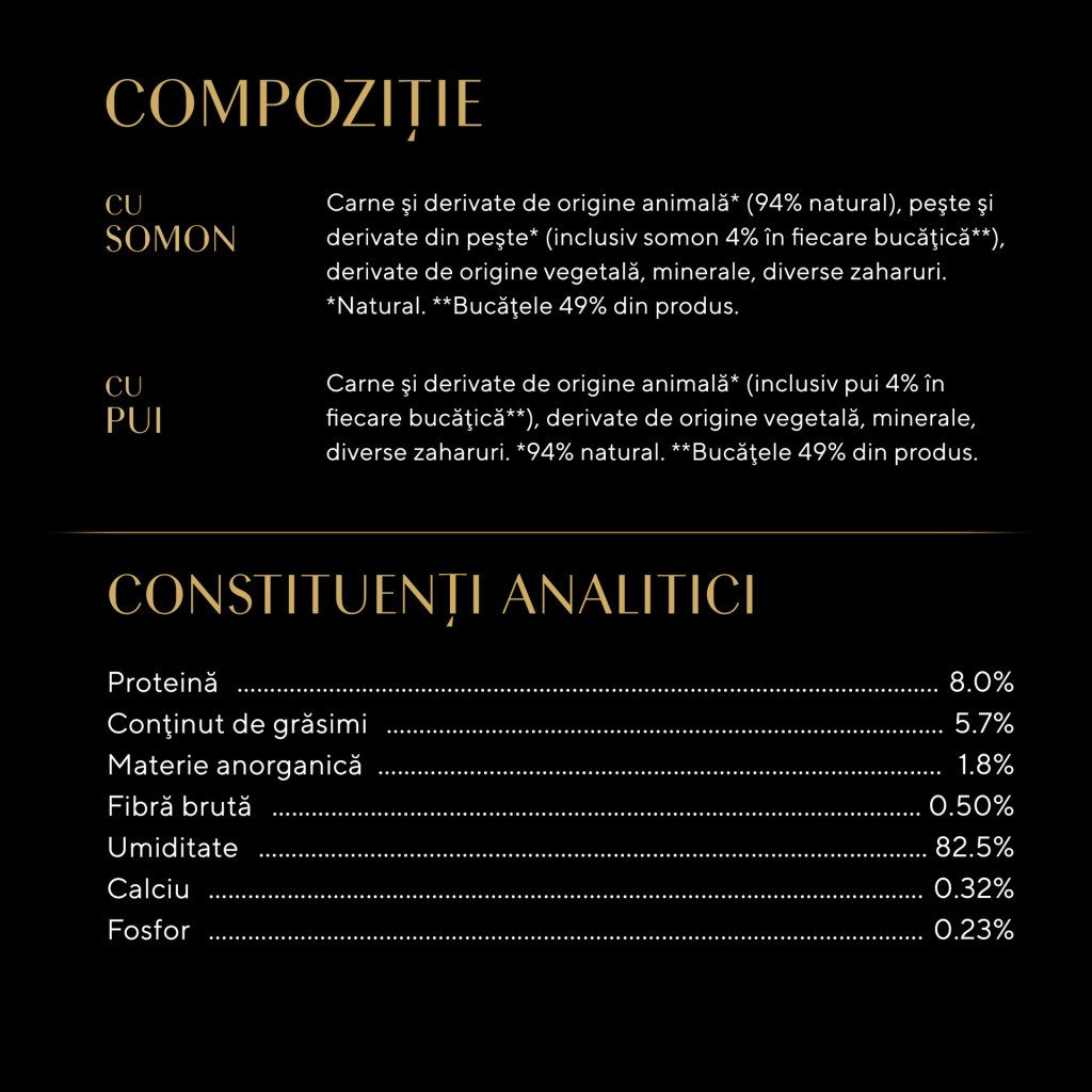 Ingrediente: cu pește: carne și derivate de origine animală* (94% natural), pește și derivate din pește* (inclusiv somon 4% în fiecare bucățică**), derivate de origine vegetală, minerale, diverse zaharuri. *Natural. **Bucățele 49% din produs.