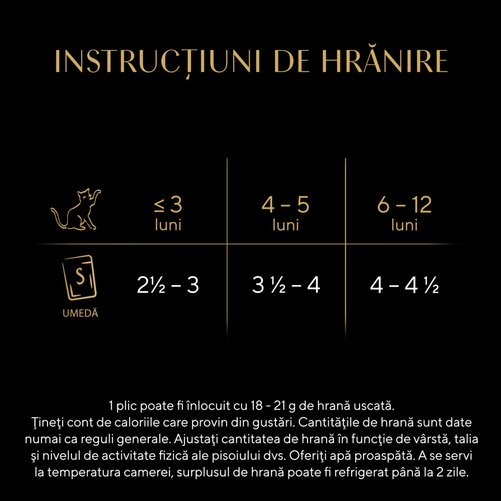 Un pui de pisică sub 3 luni necesită 2½ - 3 pliculețe zilnic, un pui de pisică de 4-5 luni necesită 3½ - 4 pliculețe zilnic, un pui de pisică de 6-12 luni necesită 4 - 4½ pliculețe zilnic. 1 plic poate fi înlocuit cu 18 - 21 g de hrană uscată.