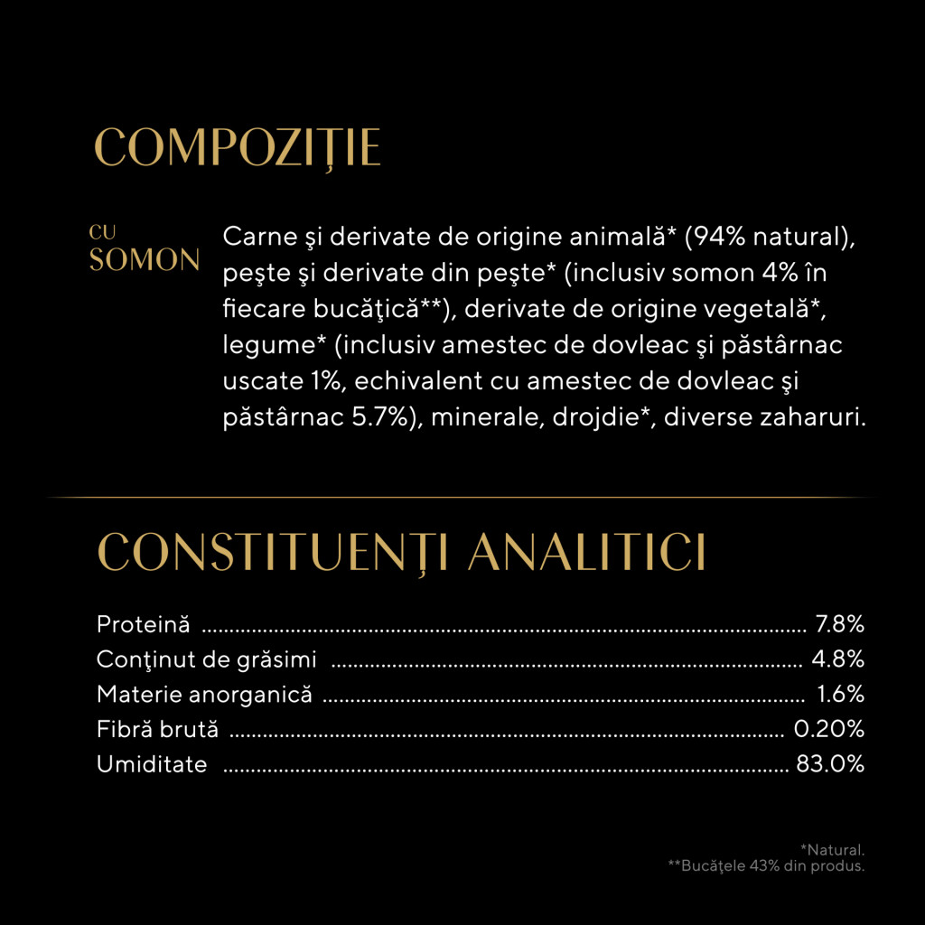 Ingrediente: carne și derivate de origine animală* (94% natural), pește și derivate din pește* (inclusiv somon 4% în fiecare bucățică**), derivate de origine vegetală*, legume* (inclusiv amestec de dovleac și păstârnac uscate 1%, echivalent cu amestec de dovleac și păstârnac 5,7%), minerale, drojdie*, diverse zaharuri.