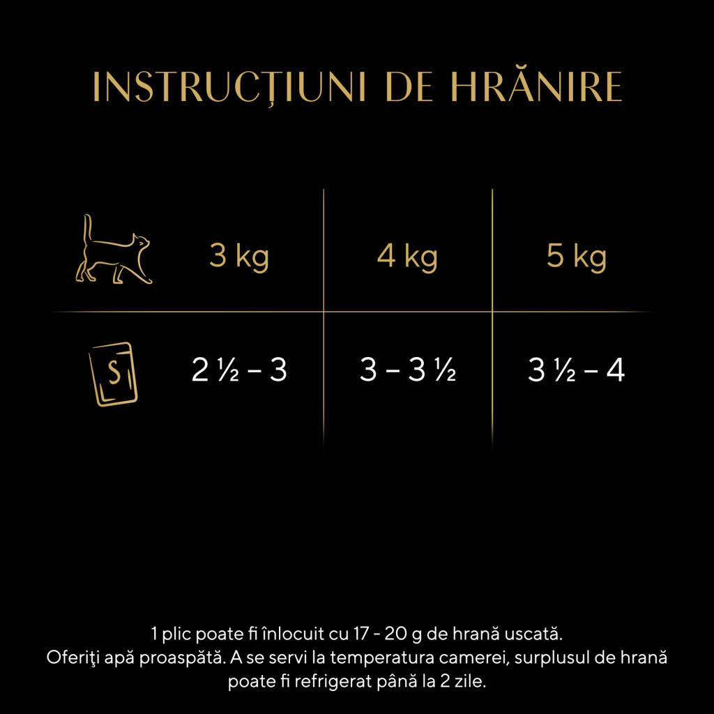 O pisică de 3 kg necesită 2½ – 3 pliculețe zilnic, o pisică de 4 kg necesită 3 – 3½ pliculețe zilnic, iar o pisică de 5 kg necesită 3½ – 4 pliculețe zilnic.