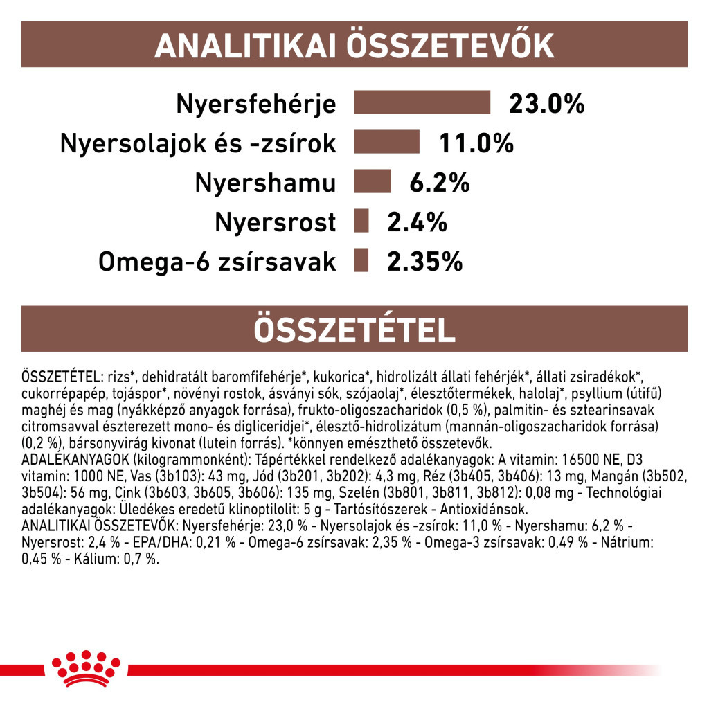 Constituenți analitici: 23,0% proteină brută, 11,0% grăsimi, 6,2% cenușă brută, 2,4% fibră brută, 0,21% EPA/DHA, 2,35% acizi grași Omega 6, 0,49% acizi grași Omega 3, 0,45% sodiu și 0,7% potasiu.