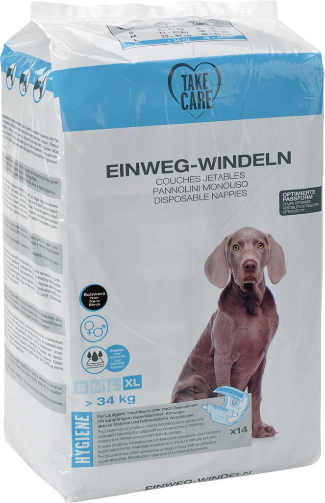 Există multe situații în care câinii au nevoie temporar de un scutec: din cauza nervozității, incontinenței, după o operație sau în perioada de călduri. Scutecele de unică folosință Take Care oferă protecție sigură și confort datorită: