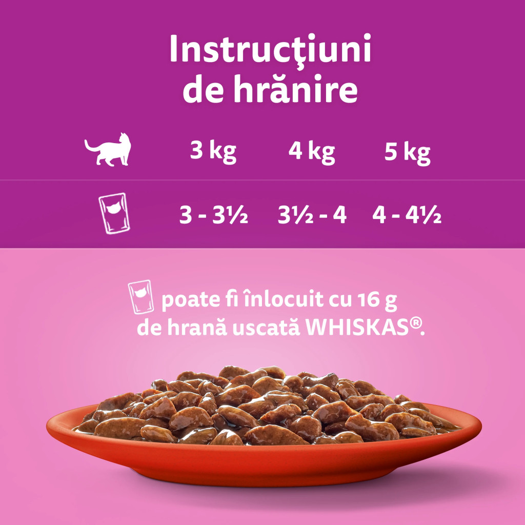 1 plic poate fi înlocuit cu 16 g de hrană uscată WHISKAS®.