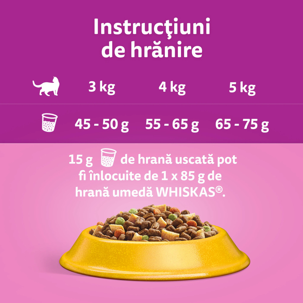 15 g de hrană uscată pot fi înlocuite de 1 pliculeț de 85 g de hrană umedă WHISKAS.