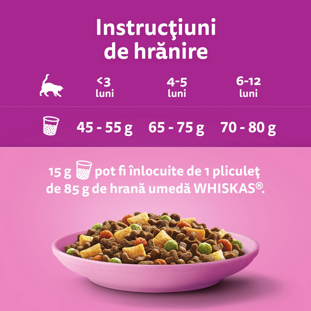 15 g de hrană uscată pot fi înlocuite de 1 pliculeț de 85 g de hrană umedă WHISKAS.