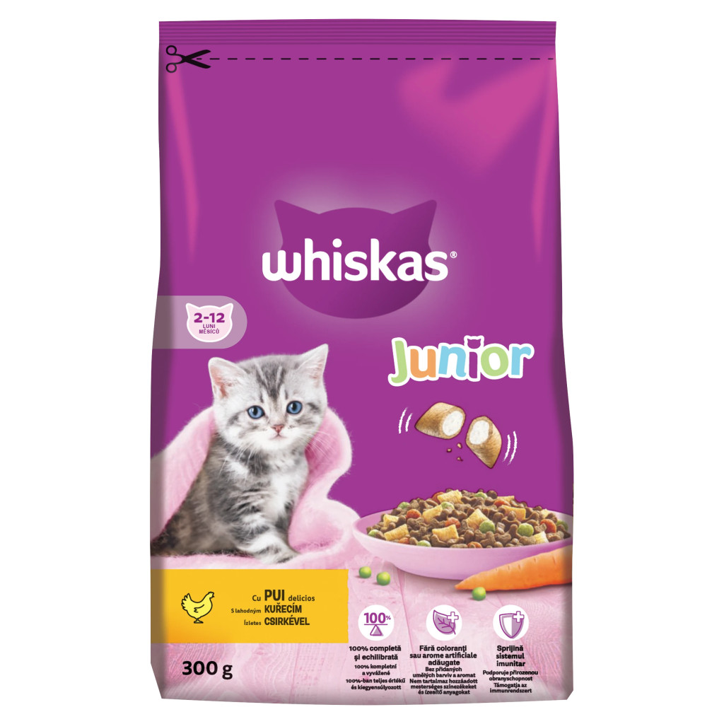 Un pui de pisică cu vârsta de până la 3 luni necesită 45–55 g de hrană uscată zilnic, un pui de pisică cu vârsta între 4–5 luni necesită 65–75 g de hrană uscată zilnic, iar un pui de pisică cu vârsta între 6–12 luni necesită 70–80 g de hrană uscată zilnic. 15 g de hrană uscată pot fi înlocuite de 1 pliculeț de 85 g de hrană umedă WHISKAS. Țineți cont de caloriile care provin din gustări. Cantitățile de hrană sunt date numai ca reguli generale. Ajustați cantitatea de hrană în funcție de vârsta, talia și nivelul de activitate fizică ale pisoiului dvs. Împărțiți în porții pentru a fi oferite de-a lungul întregii zile. Introduceți alimentele treptat atunci când schimbați dieta.