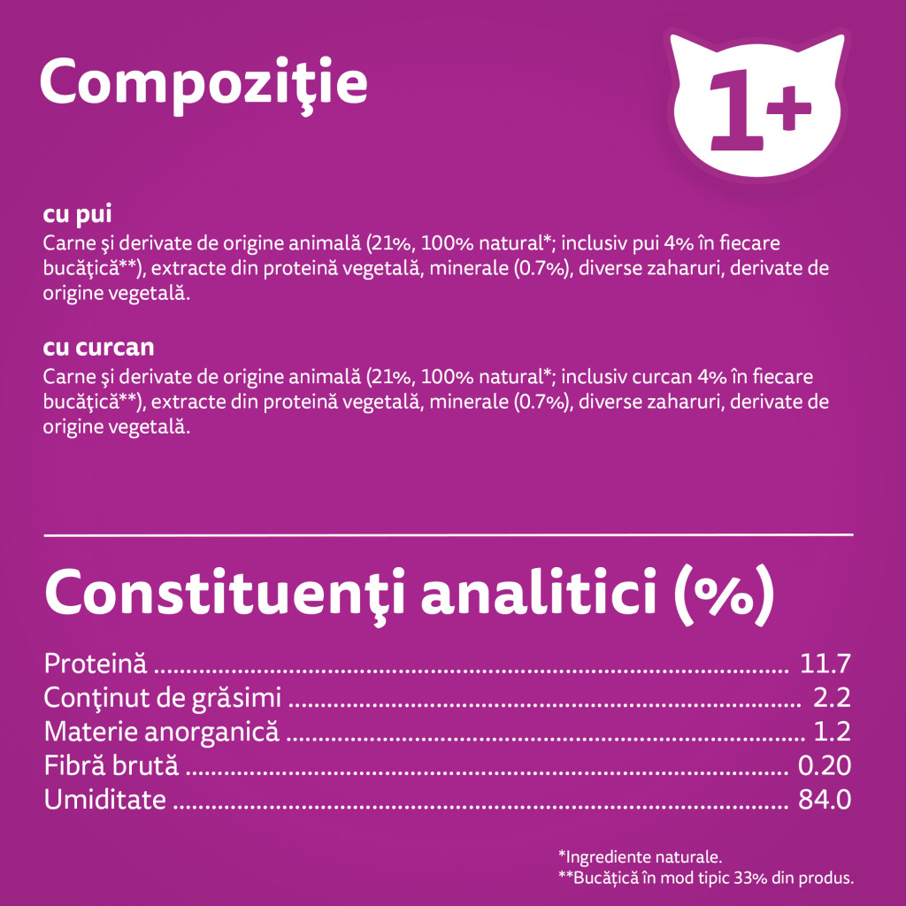 Ingrediente: carne și derivate de origine animală (21%, 100% natural*; inclusiv pui 4% în fiecare bucățică**), extracte din proteină vegetală, minerale (0.7%), diverse zaharuri, derivate de origine vegetală.