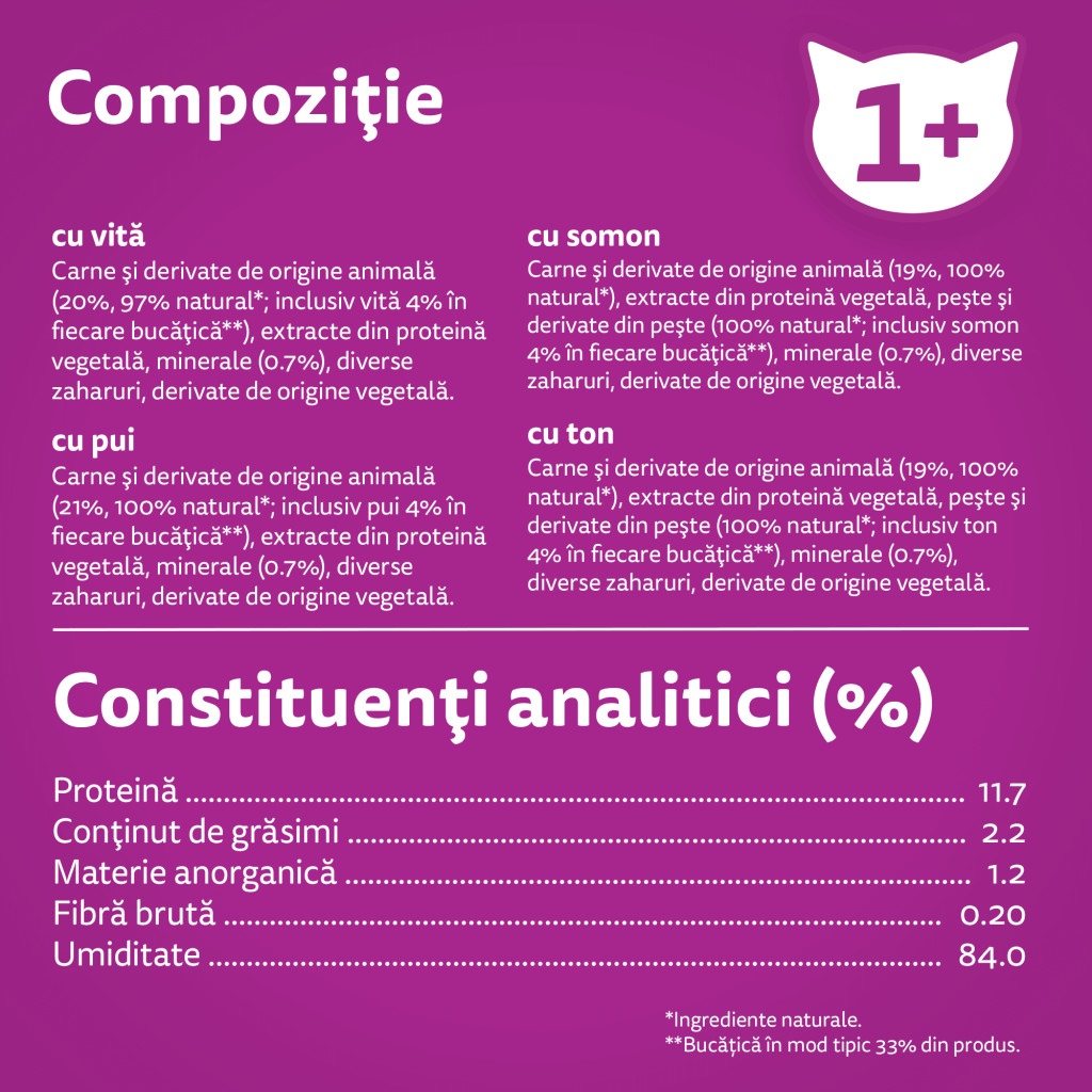 pliculeț ton: carne și derivate de origine animală (19%, 100% natural*), extracte din proteina vegetală, pește și derivate din pește (100% natural*; inclusiv ton 4% în fiecare bucățică**), minerale (0.7%), diverse zaharuri, derivate de origine vegetală. *Ingrediente naturale. **Bucățica în mod tipic 33% din produs.