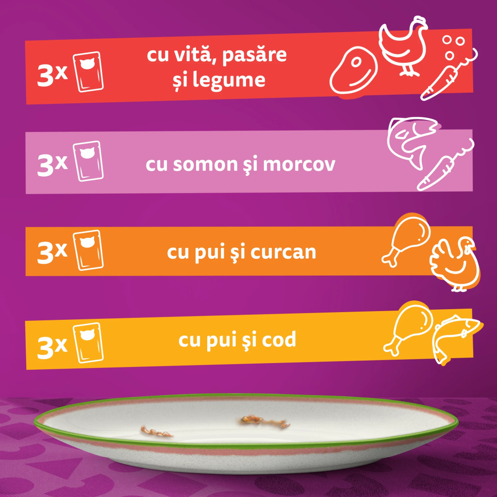 Senzații și arome delicioase ce combină proteine și legume într-un mix minunat ce garantează torsul pisicii tale; cu vitamine esențiale și Taurină pentru a ajuta imunitatea naturală, în timp ce explorează lumea lor nouă, și cu calciu pentru a ajuta creșterea oaselor puternice și a dinților; fiecare masă delicioasă asigură 100% din nevoile zilnice ale pisicii tale.