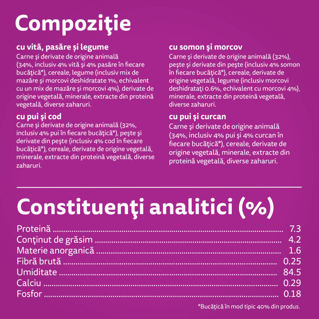Ingrediente – Pui și curcan: Carne și derivate de origine animală (34%, inclusiv 4% pui și 4% curcan în fiecare bucățică*), cereale, derivate de origine vegetală, minerale, extracte din proteine vegetale, diverse zaharuri. *Bucățica, în mod tipic, 40% din produs.