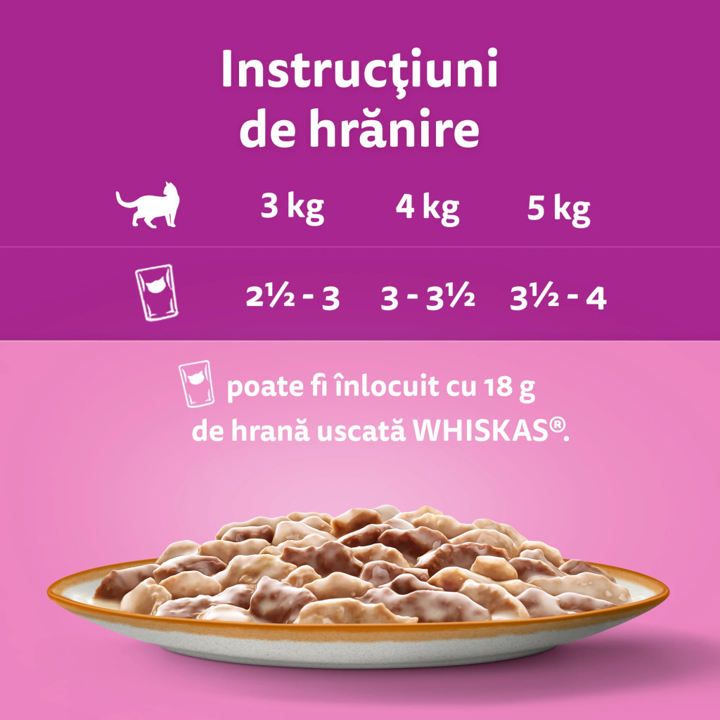 Indicații de hrănire: O pisică de 3 kg necesită 2 1/2 - 3 pliculețe zilnic, o pisică de 4 kg necesită 3 - 3 1/2 pliculețe zilnic, o pisică de 5 kg necesită 3 1/2 - 4 pliculețe zilnic. 1 plic poate fi înlocuit cu 18 g de hrană uscată WHISKAS.